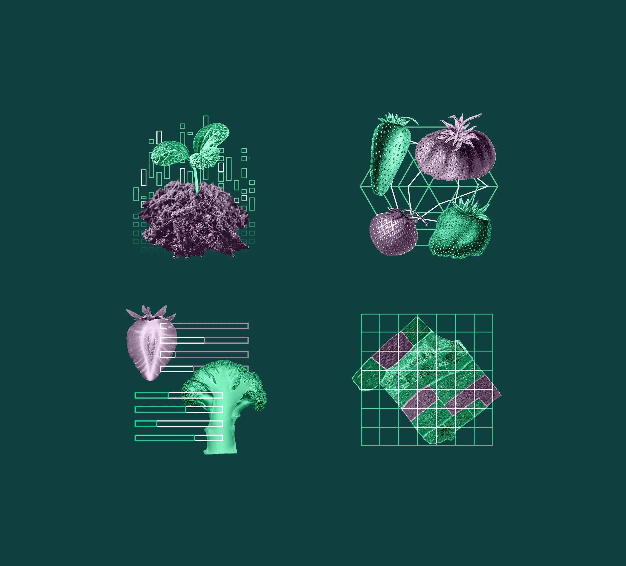 The client requested a unique palette in the agricultural space, while still using colors that made sense in context. Additionally, the client was excited about the collage illustration style. I created many collages for use in decks, the website, and other digital collateral.
