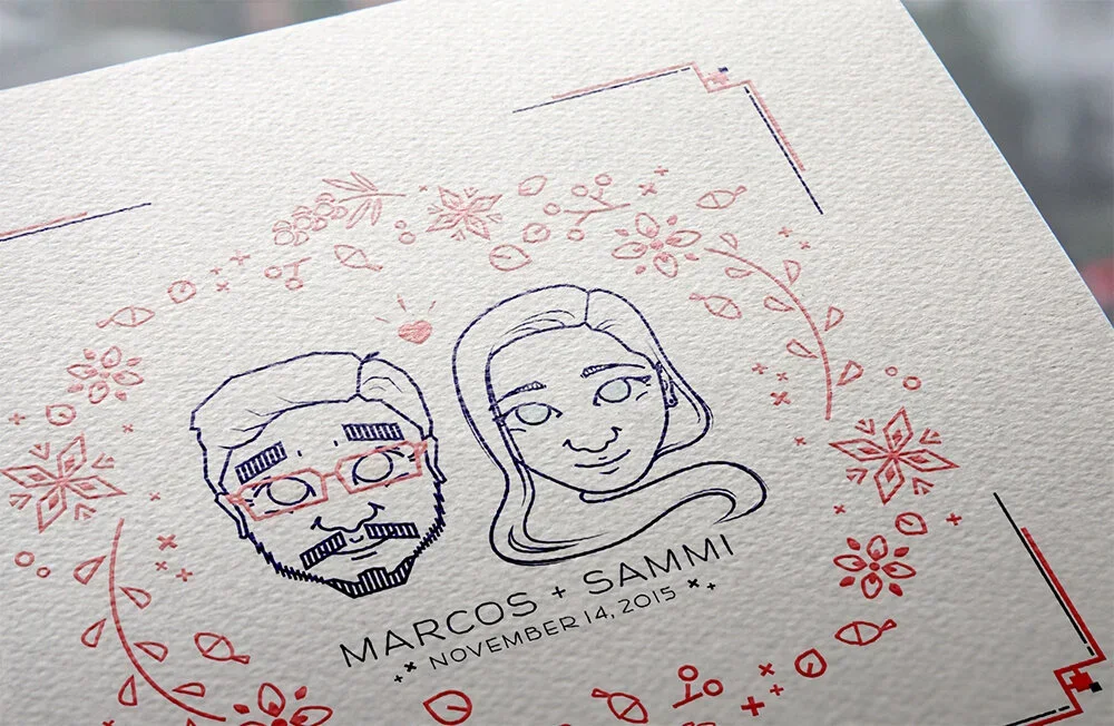 Both are native Texans, so I used native wildflowers for the garland in their wedding colors (of course). I chose to have my brother depicted in mostly angular, straight lines, while using curves for his fiancée.