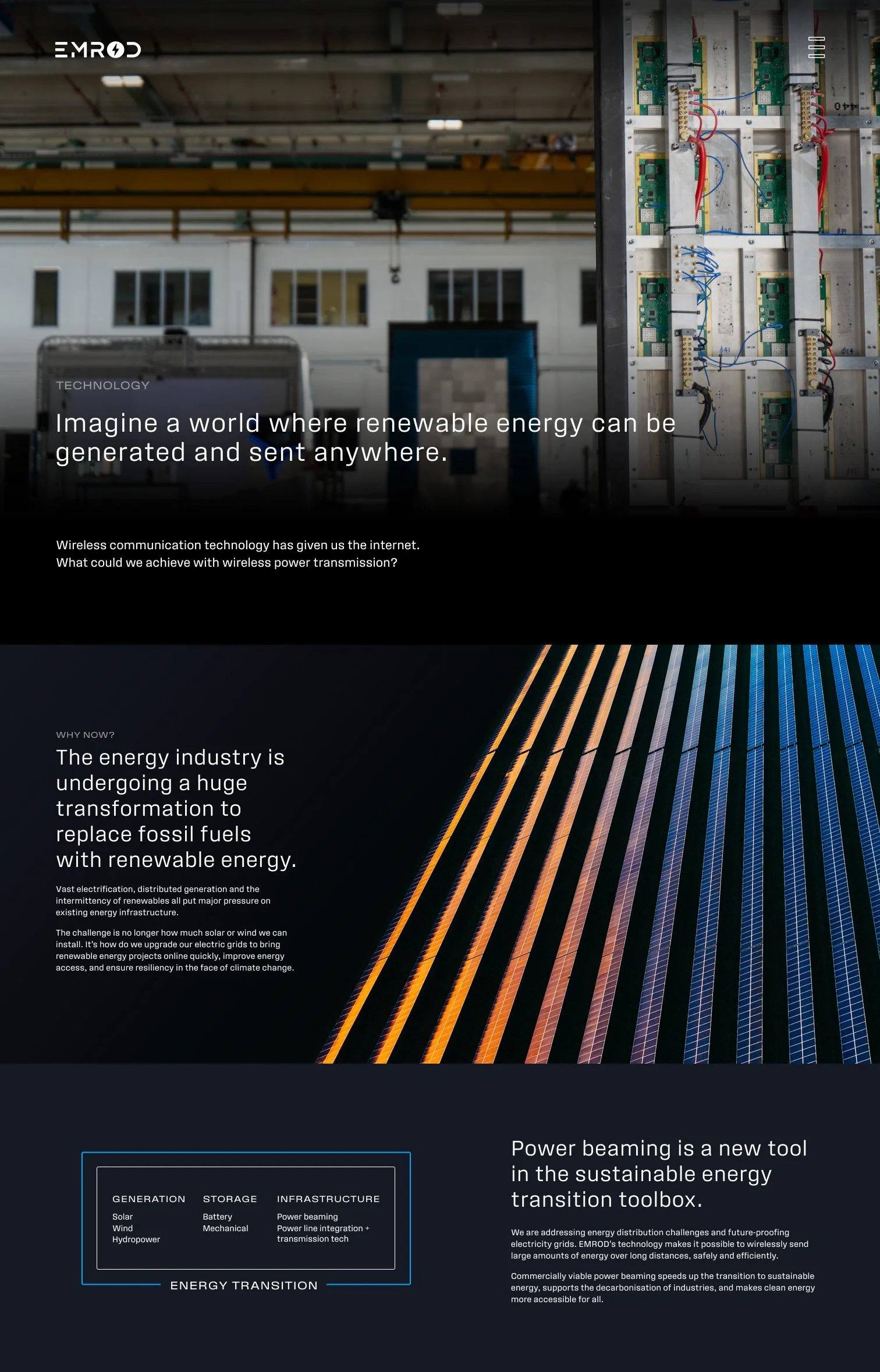 EMROD is pioneering the technology for commercially-viable long-range wireless power transfer. From deploying the first ever global energy grid in space to bringing critical power to remote ground locations, the system would transmit large amounts of energy over long distances, no wires needed.