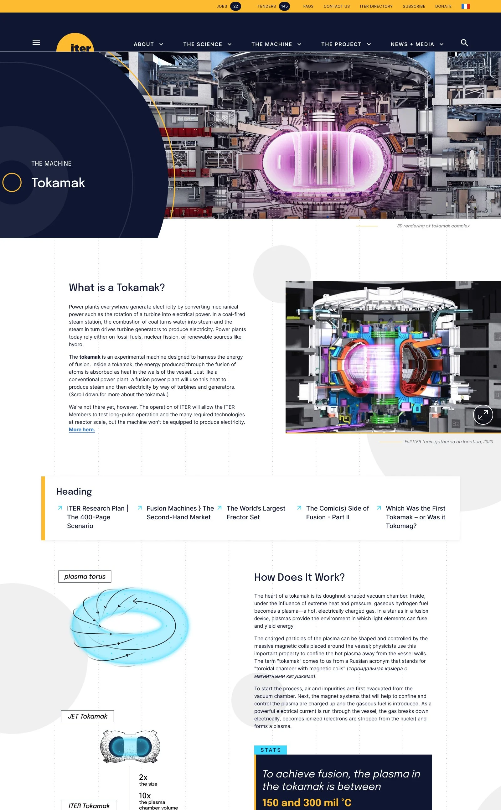 I created a small series of infographics and animations to help explain the tokamak fusion device in both scale and function (the fusion molecular reaction that will be achieved inside).