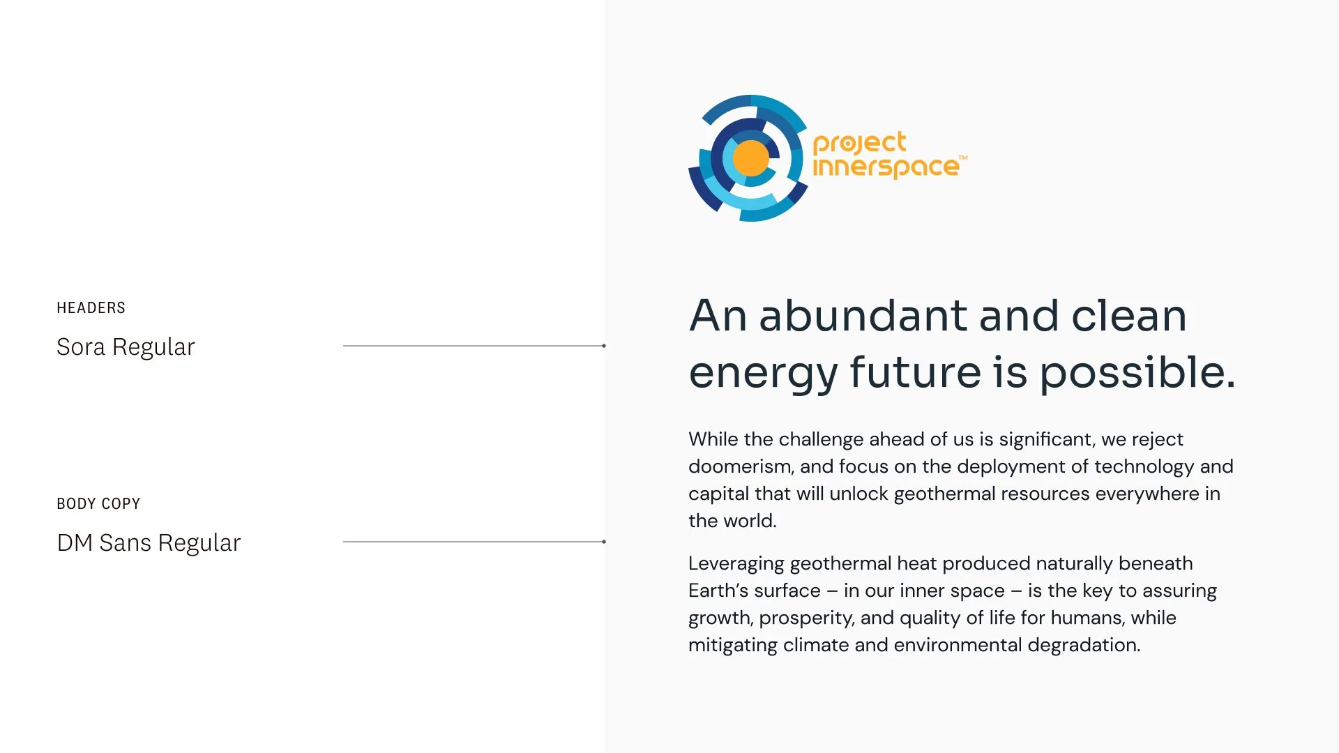 The client desired a font with a bit of a tech bent, but still approchable and interesting to look at. The font Sora, with its rounded corners and tall x-height, was a good fit. We also enjoyed the thematic coincidence: “sora” means “sky” in Japanese, the boundary of inner space and outer space.
