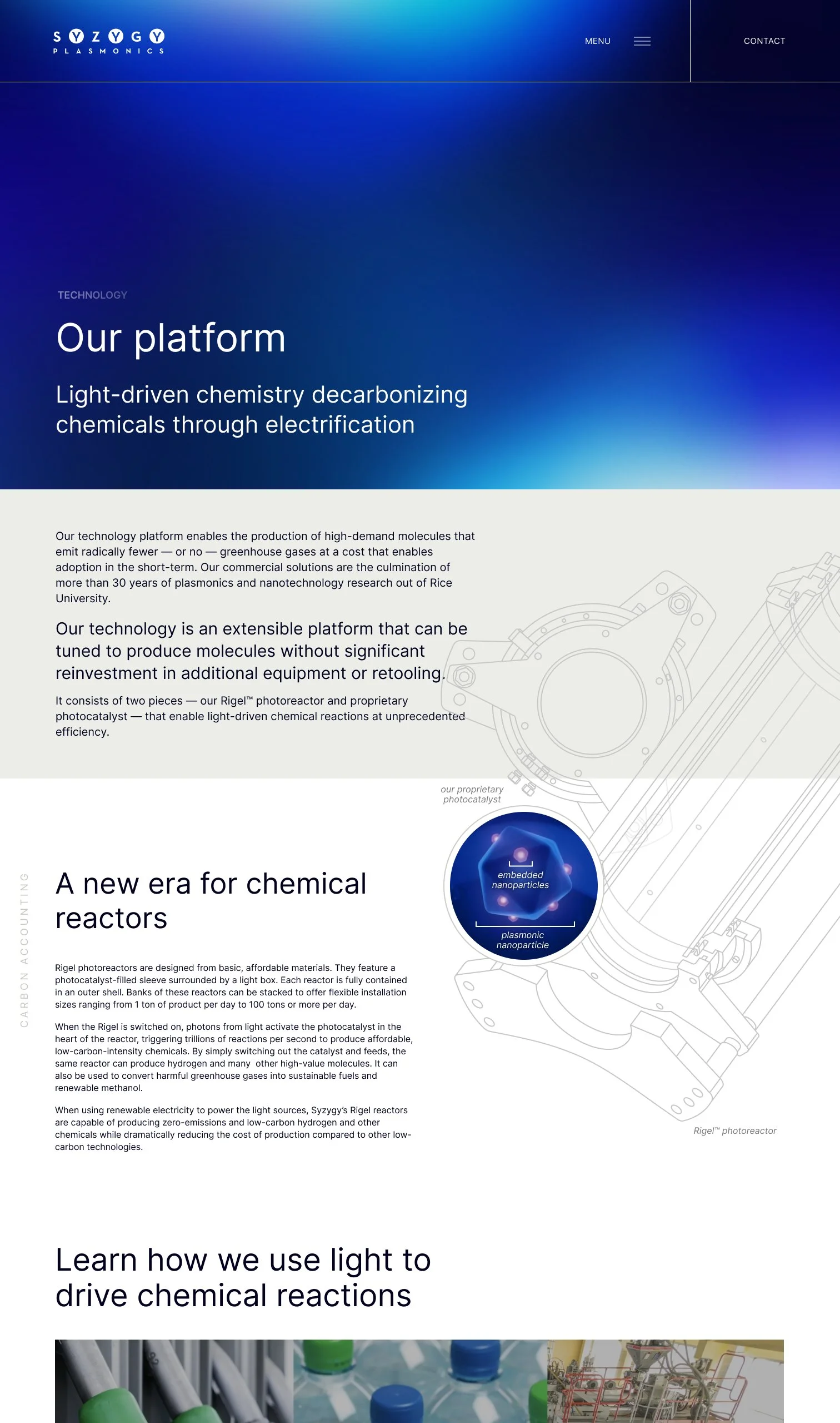Syzygy Plasmonics aims to decarbonizing the chemical industry, which is currently responsible for almost 20% of industrial CO₂ emissions. Syzygy uses light instead of combustion to drive chemical reactions. Their Rigel™ reactor cells channel light into high-efficiency photocatalysts, delivering a lower-carbon and lower-cost solution for chemical producers.