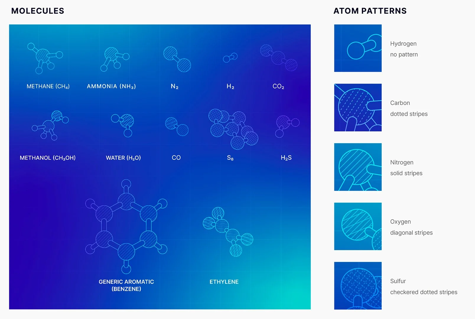 In case of further breakthroughs and future chemical reaction illustration needs, a specific page in the brand guidelines detailed each existing molecule, and the repeating pattern that was associated with each individual element.