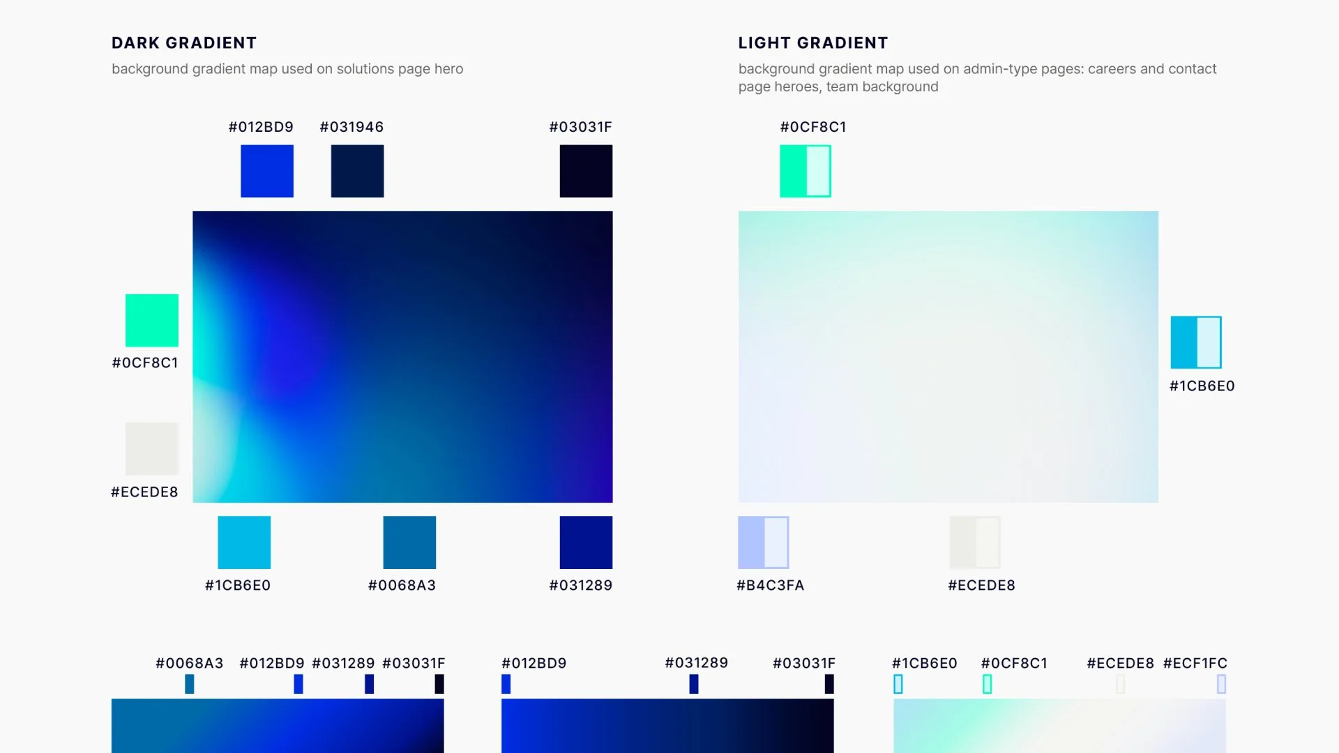 An extensive brand guideline document was created, detailing gradient creation and usage, color overlays, technical line illustrations, and more.