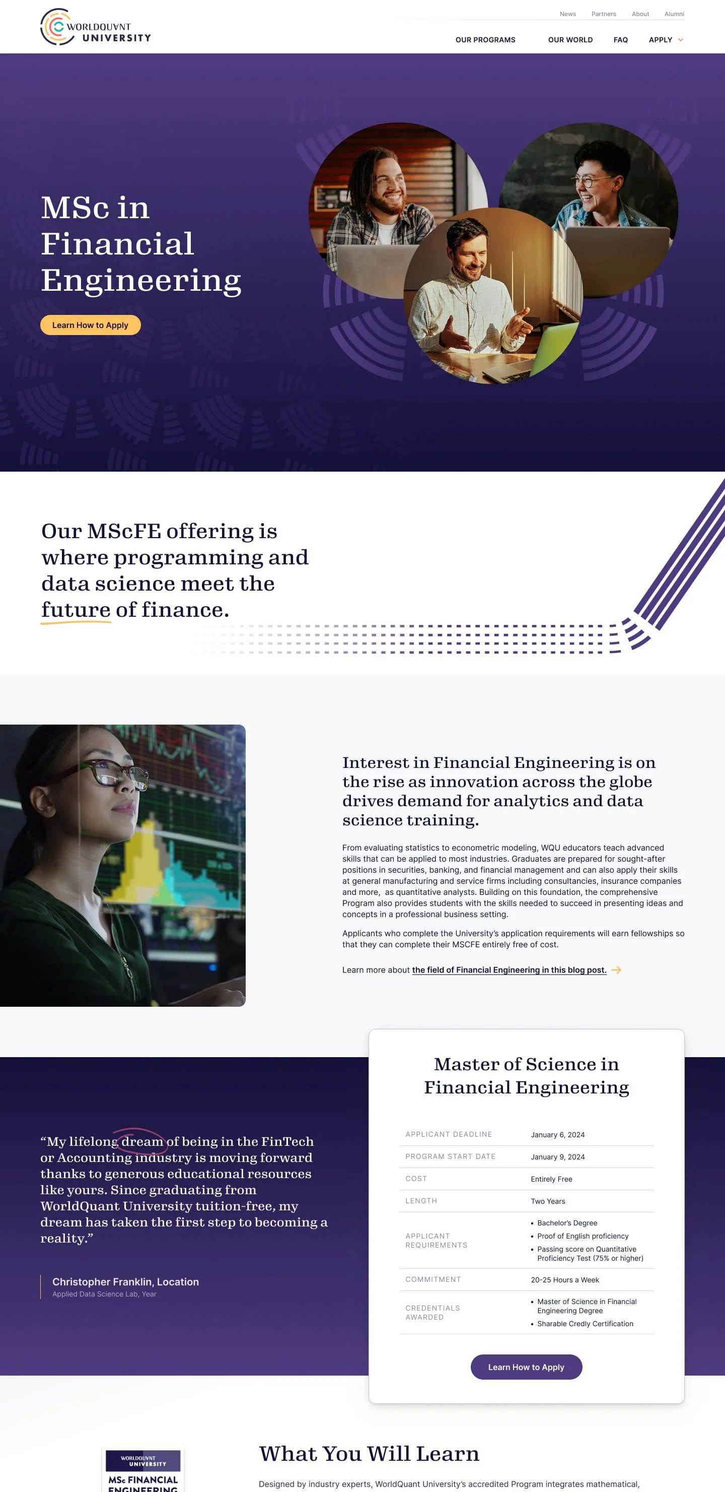 WorldQuant University is an entirely free online university. Their ongoing mission is to make advanced, quality education in the data sciences available free-of-charge to capable students, anywhere in the world.